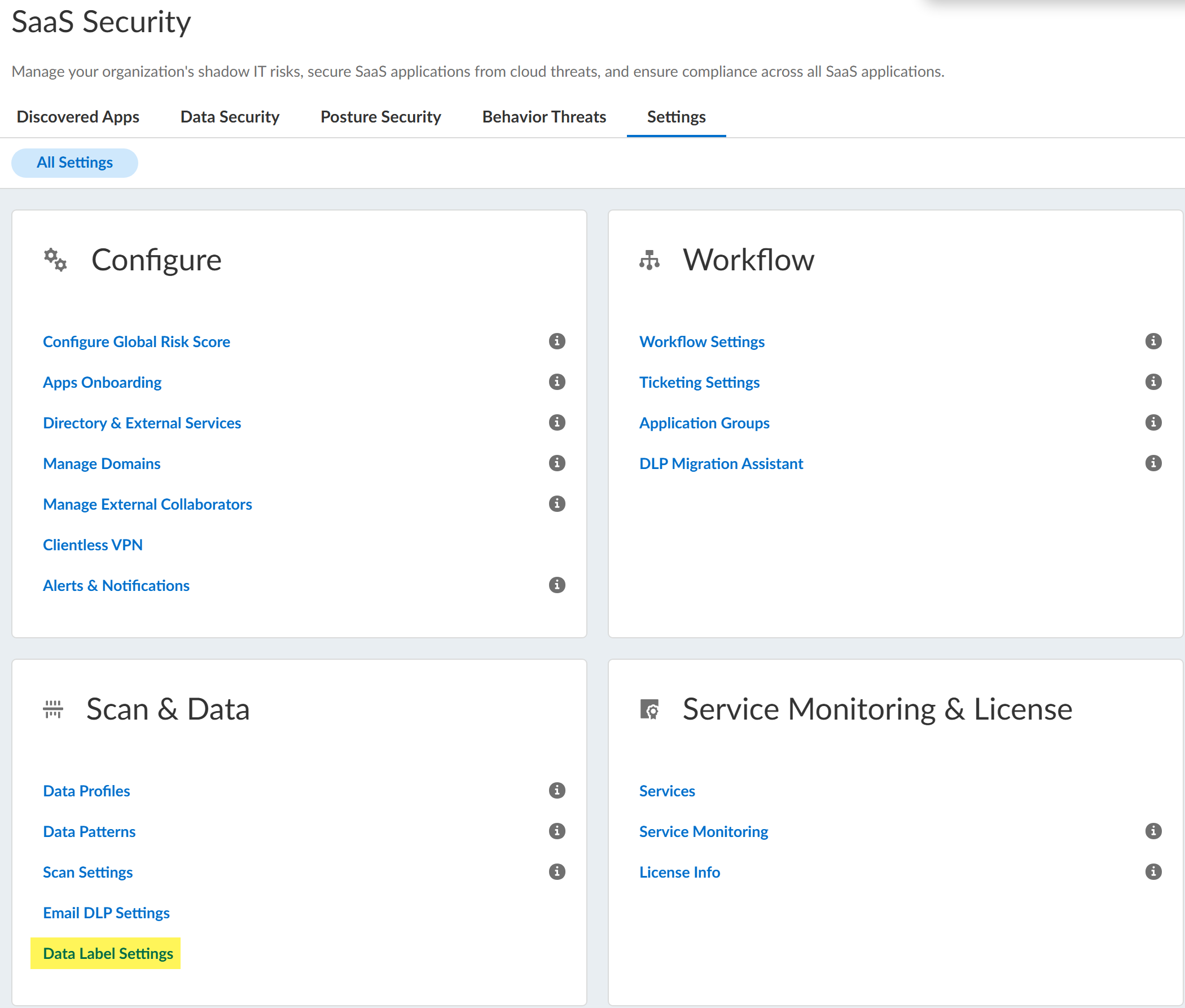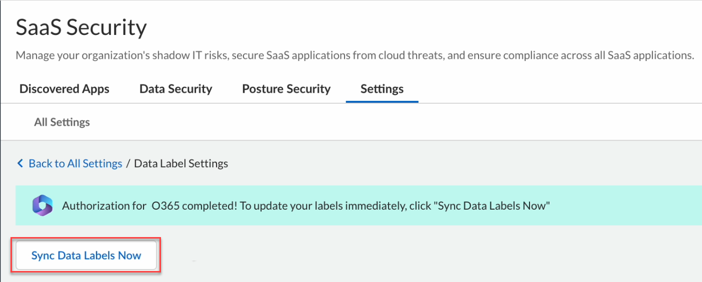 - Log in to Strata Cloud Manager.Select ConfigurationSaaS SecuritySaaS SecuritySettingsData Label Settings. The Office 365 instances which support data labeling are listed.