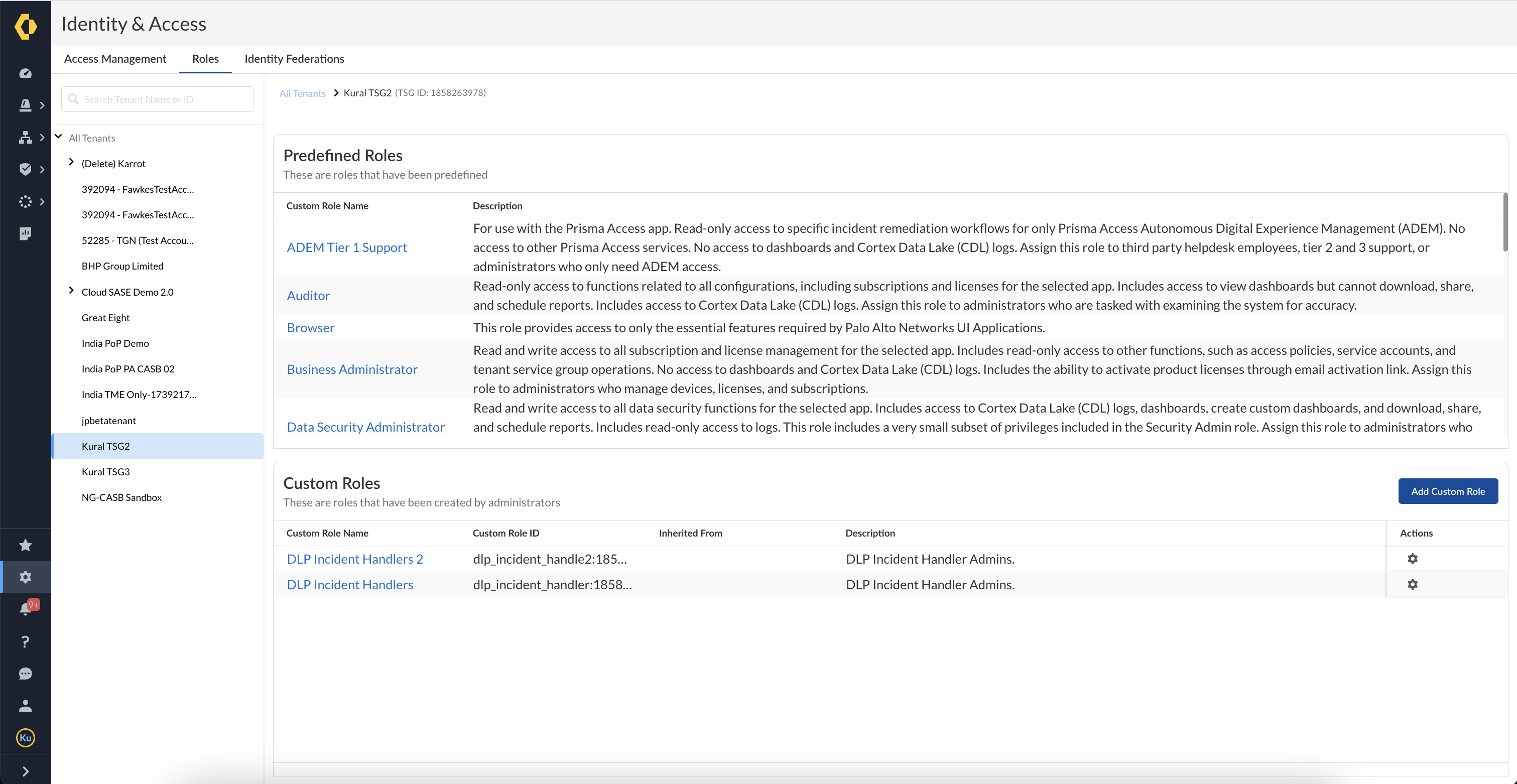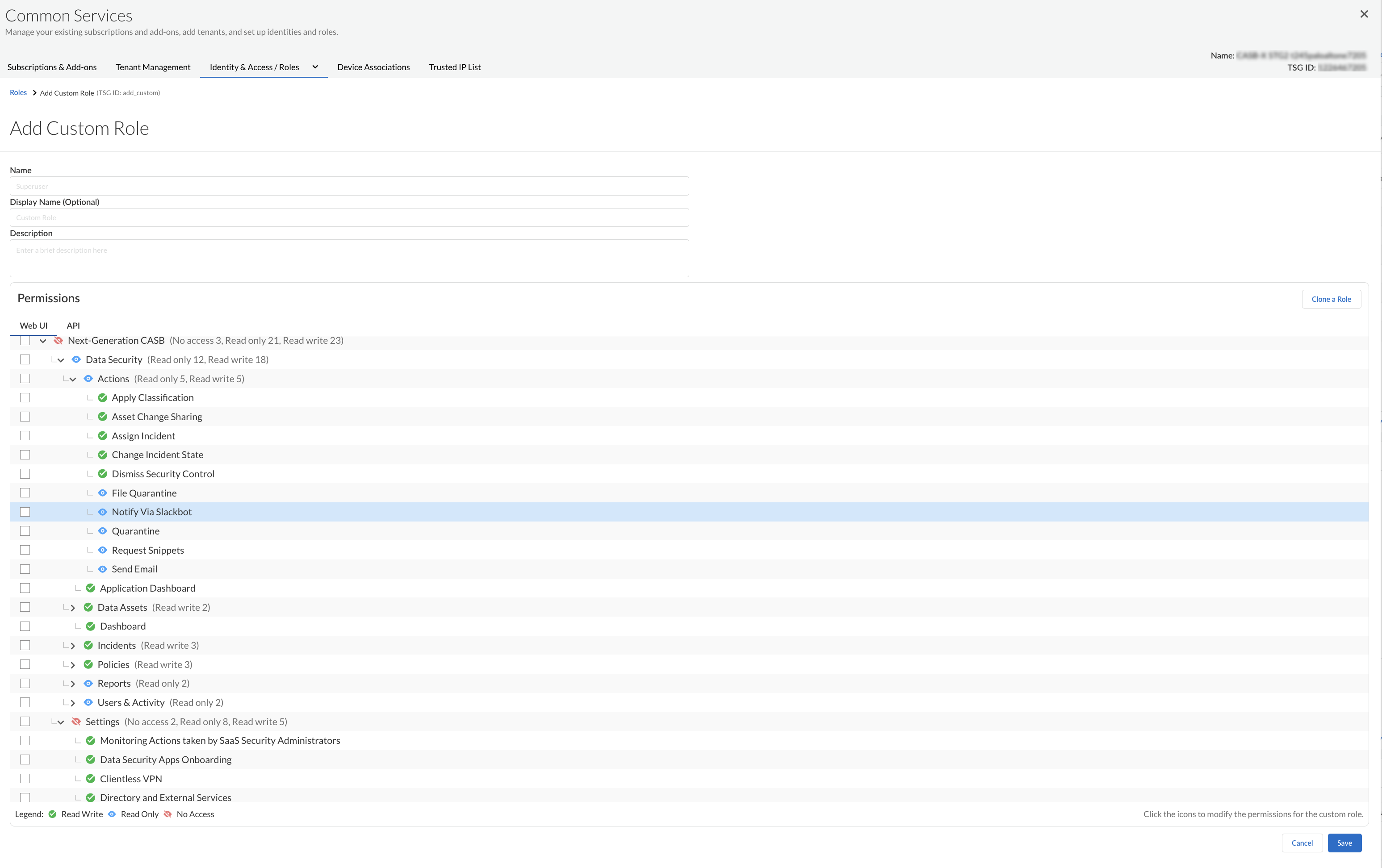 - Log in to Strata Cloud Manager as a Super User and add custom admin roles through Common Services.![]() Edit the custom roles as per your requirement available under Next-Generation CASBData Security and Next-Generation CASBSettings. Edit the custom roles as per your requirement available under Next-Generation CASBData Security and Next-Generation CASBSettings.- Data Security—Dashboard, Applications, Data Assets, Incidents, Policies, Reports, Users & Activity, and Actions.