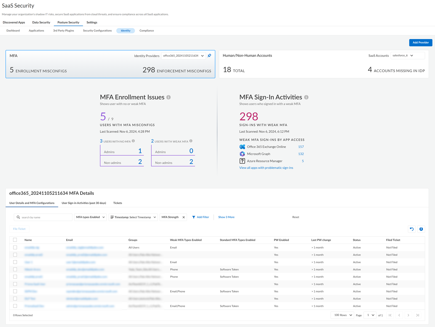 The Identity Security component of SaaS Security Posture Management uses information from your identity provider to give you visibility into MFA enrollment and sign-in issues.