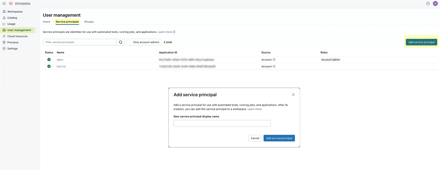 - Navigate to the User Management page. To do this, from the left navigation pane, select User management.On the User Management page, select the Service principals tab and Add service principal.In the Add Service Principal dialog, specify a name for the service principal.This name is the display name for the service principal. It will appear in searches and in the list of service principals on the Service principals tab. For these reasons, specify a meaningful name for the service principal. For example: SSPM Service Principal.