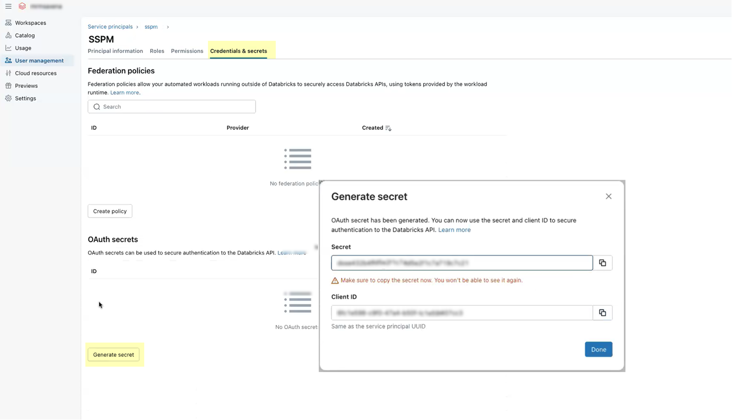 To close the Add Service Principal dialog and create the service principal, click Add service principal.Databricks displays a configuration page for your new service principal. If Databricks does not display the configuration page for the service principal, you can open it from the list of service principals on the Service principals tab.On the configuration page for your service principal, select the Roles tab and select the Account admin role.In the configuration page for your service principal, select the Credentials & Secrets tab and Generate secret.In the Generate OAuth Secret dialog, specify an expiration period for the service principal and Generate the secret.Databricks displays the application credentials (Client ID and Client Secret) for your service principal.Copy the Client ID and Client Secret and paste them into a text file.Don’t continue to the next step unless you have copied the Client ID and Client Secret. You will provide this information to SSPM during the onboarding process.