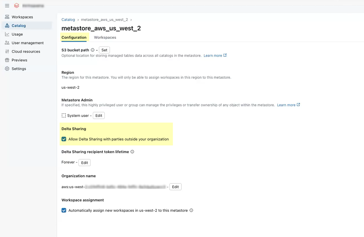 From the overview page for your SQL warehouse, Start the warehouse.Enable Delta Sharing for your Databricks workspaces. From the left navigation pane, select Workspaces to open the Workspaces page.Repeat the following steps for each of your workspaces:- On the Workspaces page, click the link for the workspace's Metastore.On the Configuration tab for the metastore, select the check box to Allow Delta Sharing with parties outside your organization.