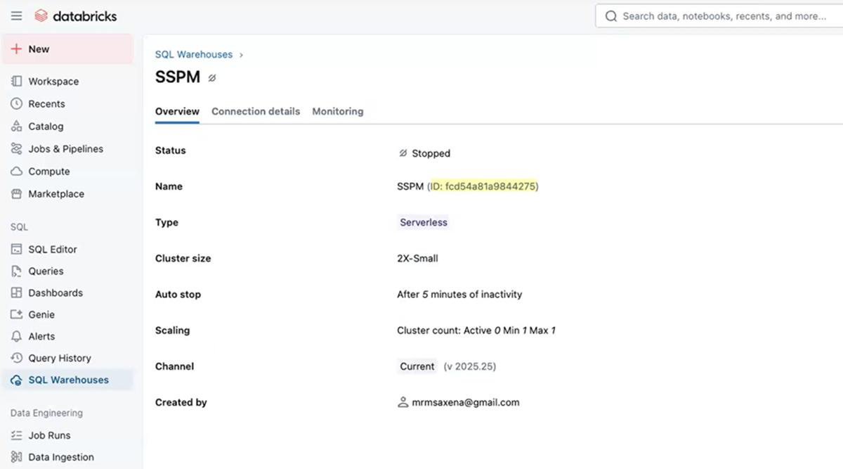 - Create the SQL warehouse.Databricks creates the SQL warehouse and displays an Overview of the SQL warehouse's properties.