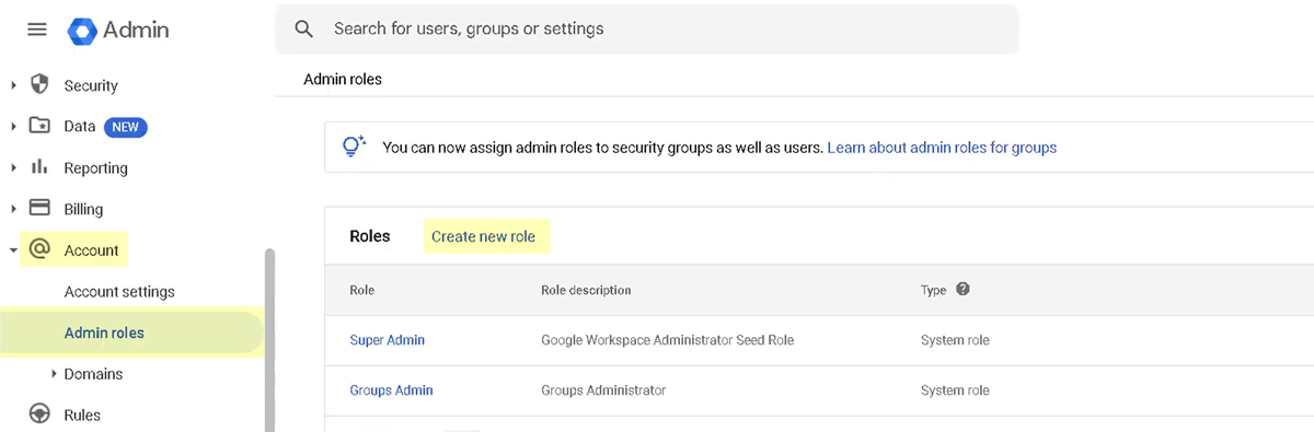 - From the Google Workspace Admin Console menu, select AccountAdmin roles.