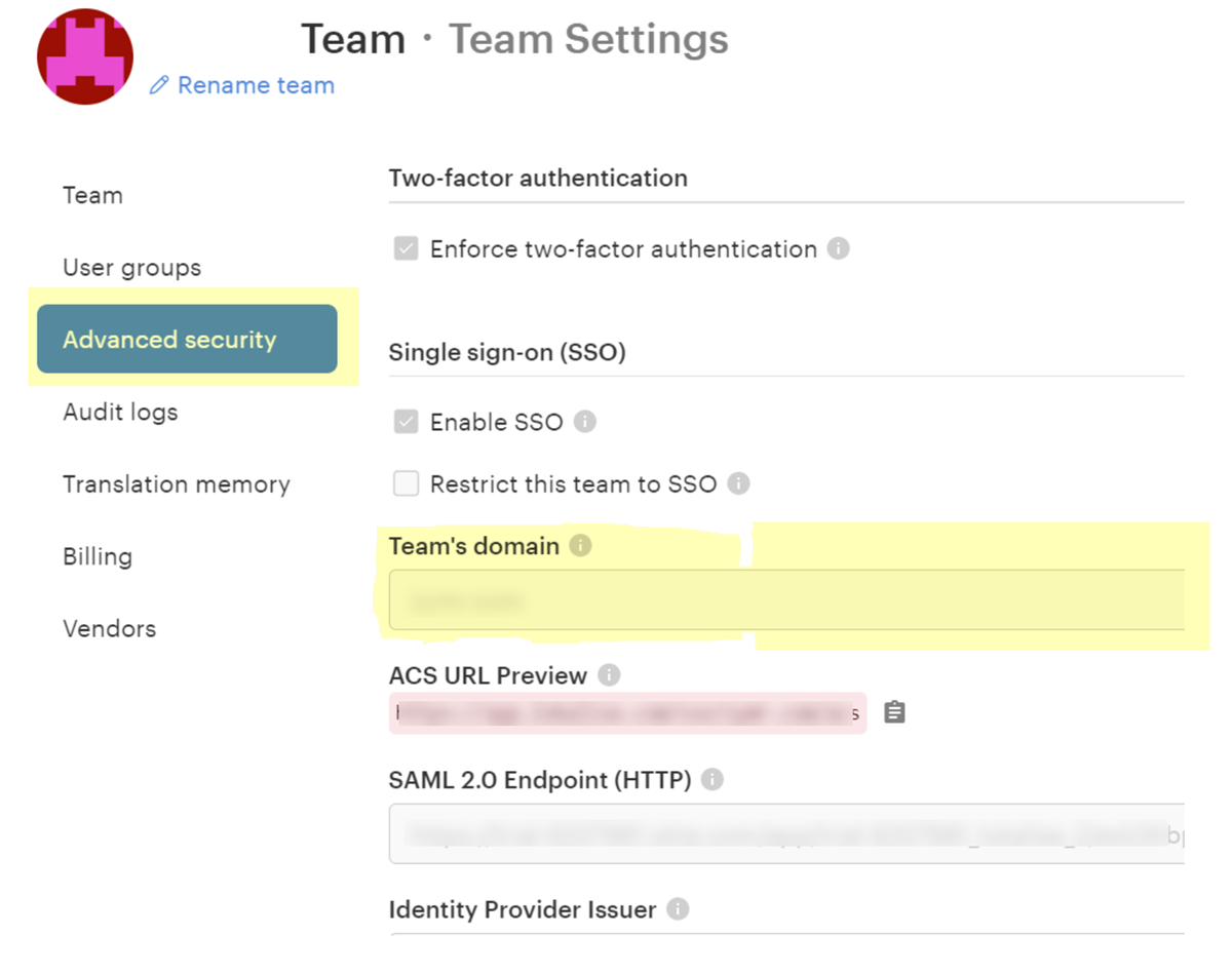 | Team Domain | A domain specified in your team's advanced security settings, and which Lokalise uses for single sign-on (SSO). |