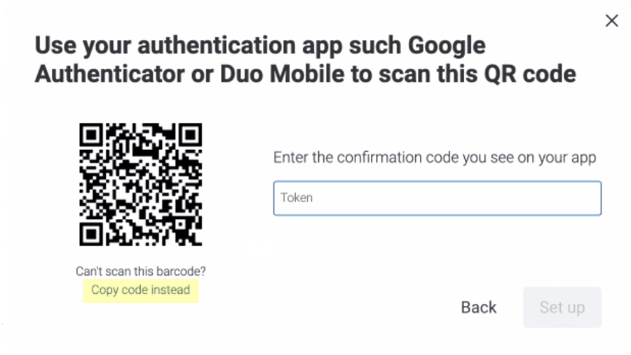 - A pop-up window displays your MFA secret key as a QR code, but do not scan the QR code. Copy code instead to display a text version of the MFA secret key.