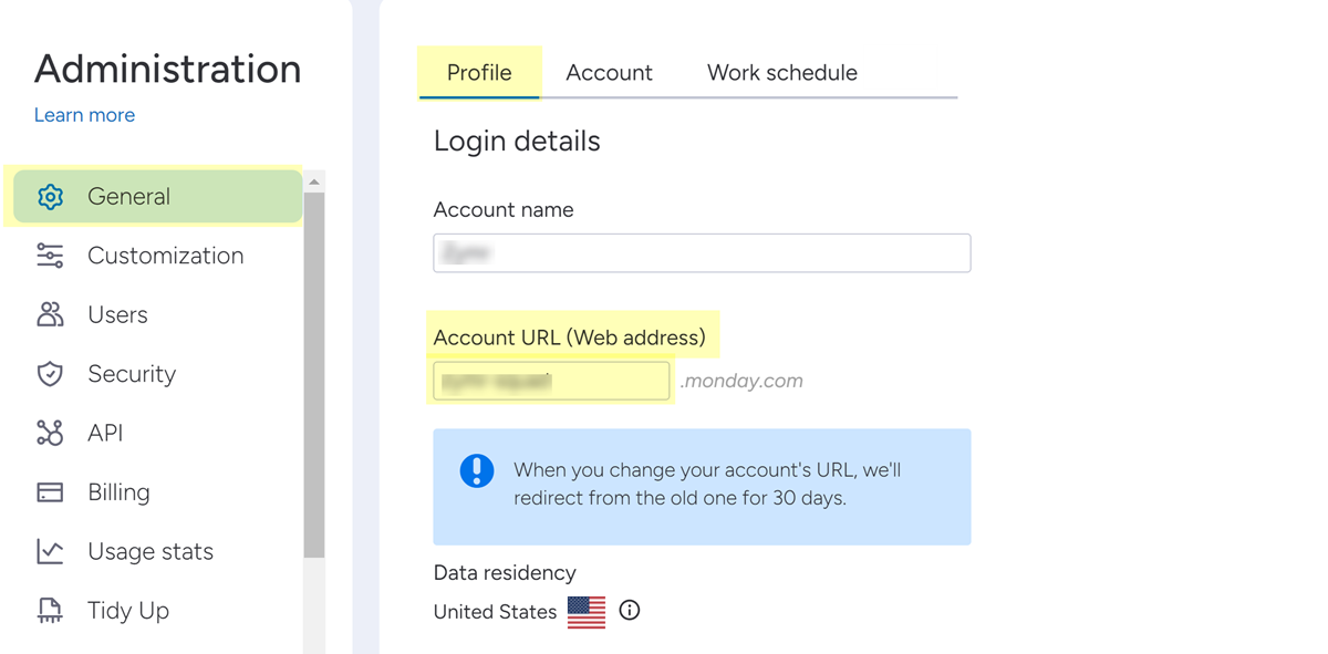 | Account Domain | The custom domain for your monday.com account. After you log in to monday.com, this domain is part of your monday.com URL in the format <account_domain>.monday.com. |