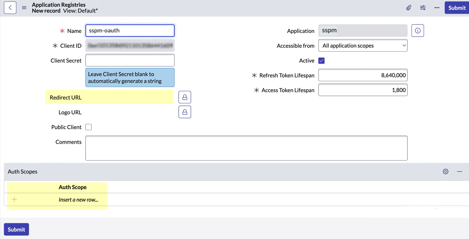 | Client ID | SSPM will access a ServiceNow API through an OAuth 2.0 application that you create. ServiceNow generates the Client ID to uniquely identify the application. |