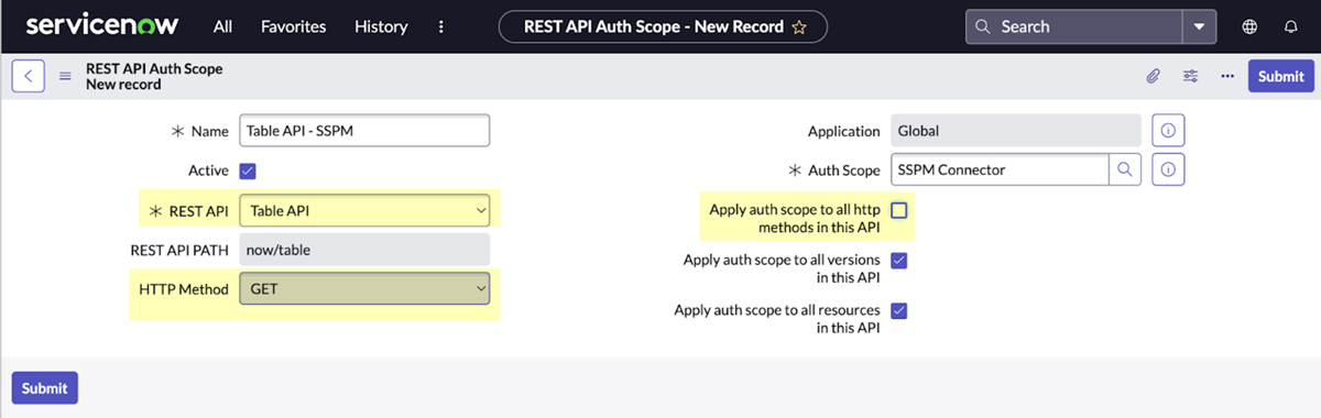 Create a REST API Auth Scope and link it to your authentication scope.The REST API Auth Scope is where you will limit SSPM access to the Table API only. You can allow SSPM full read and write access to perform all HTTP methods, or you can limit SSPM to read-only access (GET method only).- Navigate to the REST API Auth Scopes list (System Web ServicesAPI Auth ScopesREST API Auth Scope).