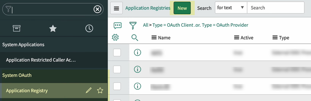 Create your OAuth 2.0 application in ServiceNow.- Log in to ServiceNow as an administrator.Navigate to the Application Registries page (System OAuth Application Registry).From the Application Registries page, create a New application.