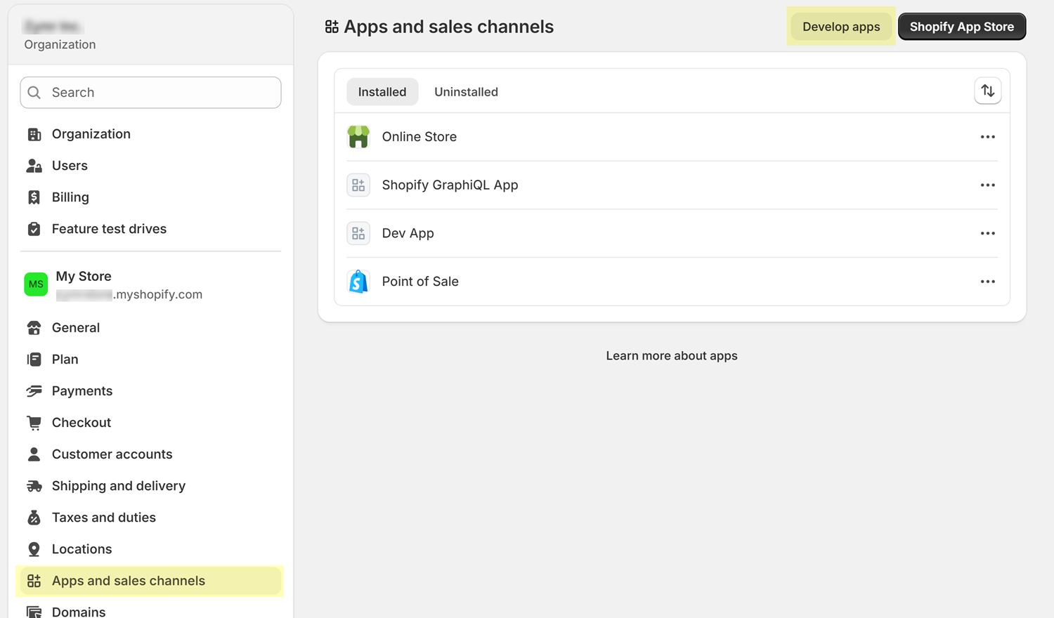 - Open a web browser to the Shopify login page and log in to the Shopify store that you want SSPM to scan.Navigate to your store settings. To navigate to your store settings, click Settings in the lower-left corner of the page.From the left navigation pane of the settings page, select Apps and sales channels.On the Apps and sales channels page, click Develop apps.