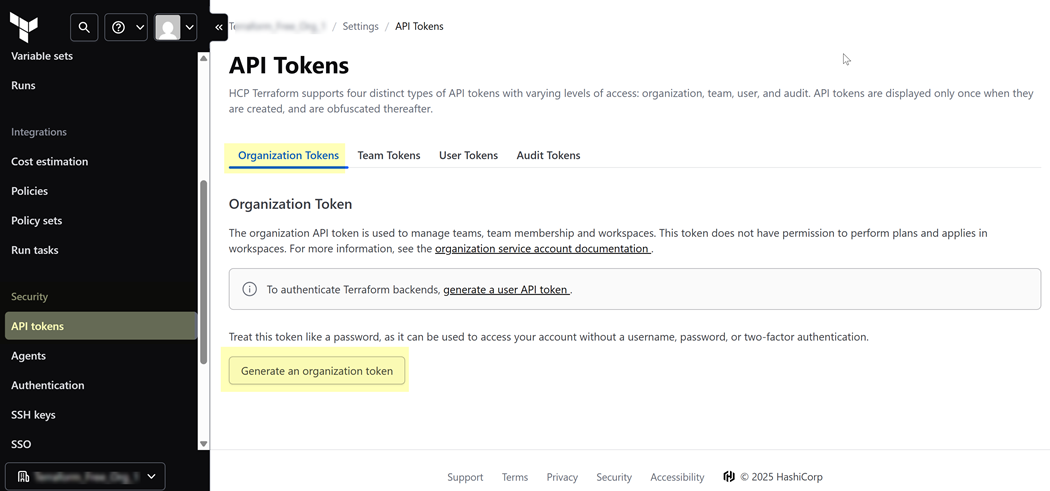 - Open a web browser to the Terraform login page, and log in as an Organization Owner for the organization that you want SSPM to scan.Required Permissions: To generate an Organization API Token, you must use an account assigned to the Organization Owner role.If necessary, select the Terraform organization for SPPM to scan.If you're a member of multiple Terraform organizations, select the organization that you want SSPM to scan. You can select the organization from the Choose an Organization list, which is located in the lower-left corner of the Terraform page.In the left-hand navigation pane, select Settings.Navigate to the organization's API Token settings. In the left-hand navigation pane, select API Tokens.On the API Tokens page, select the Organization Tokens tab.Generate an organization token.