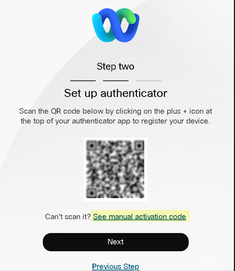 If the Webex administrator account is already configured for MFA, and if you know the MFA secret key value, you don't need to complete the following steps. You need only provide the MFA secret key to SSPM during the onboarding process.