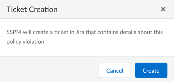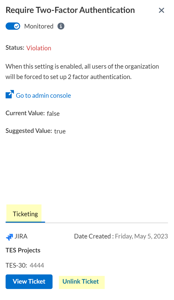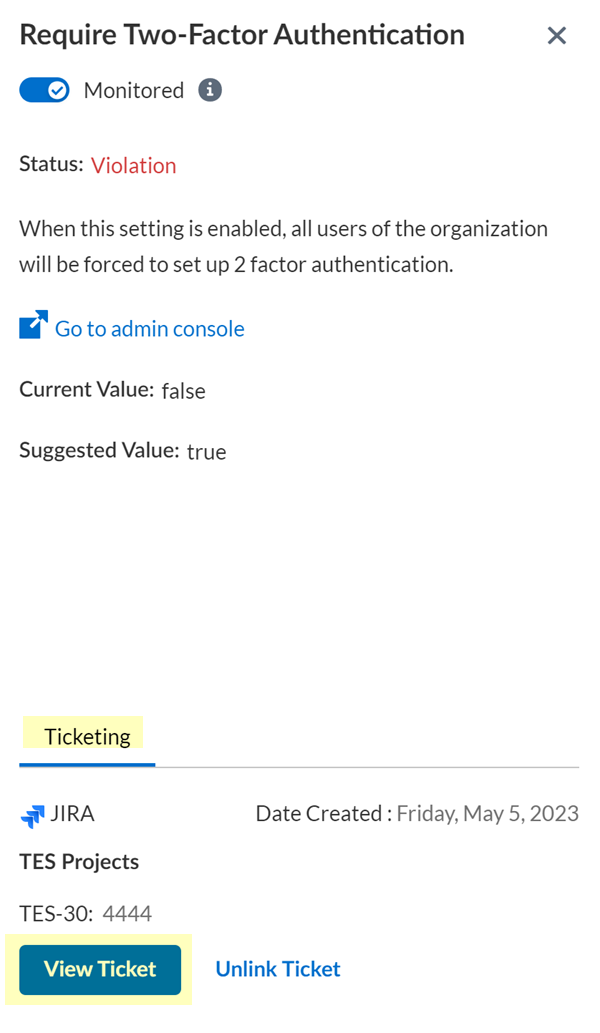 Create the ticket.SSPM creates a ticket for this violation. The ticket contains details about this violation, such as the current and recommended values for the setting.View a Ticket Associated With a Rule Violation