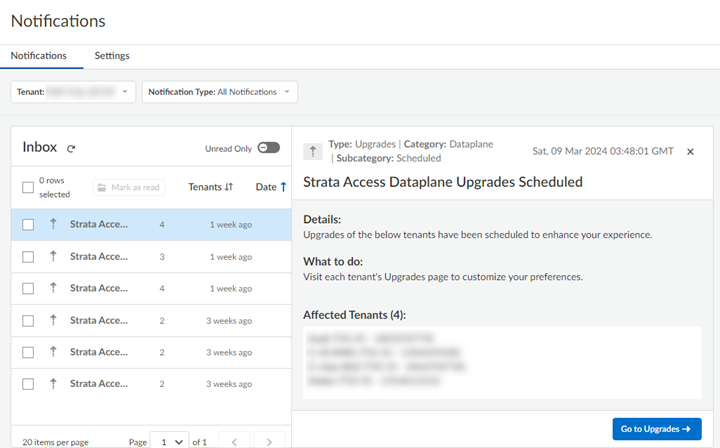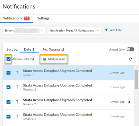 - Access the Strata Multitenant Cloud Manager and select the bell icon.Select Notifications.(Optional) You can filter by unread only, tenant, or notification type: all notifications, announcements, or upgrades.(Optional) You can sort by date or tenants impacted.Read the messages that inform you about necessary actions or help you to make informed decisions.