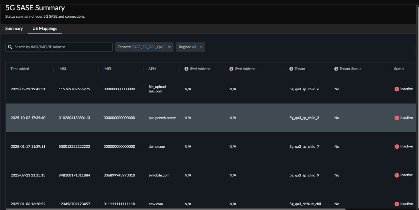 | Tenant and its Status | The name of the organization/customer the UE belongs to, alongside their service status (e.g., active/inactive). |