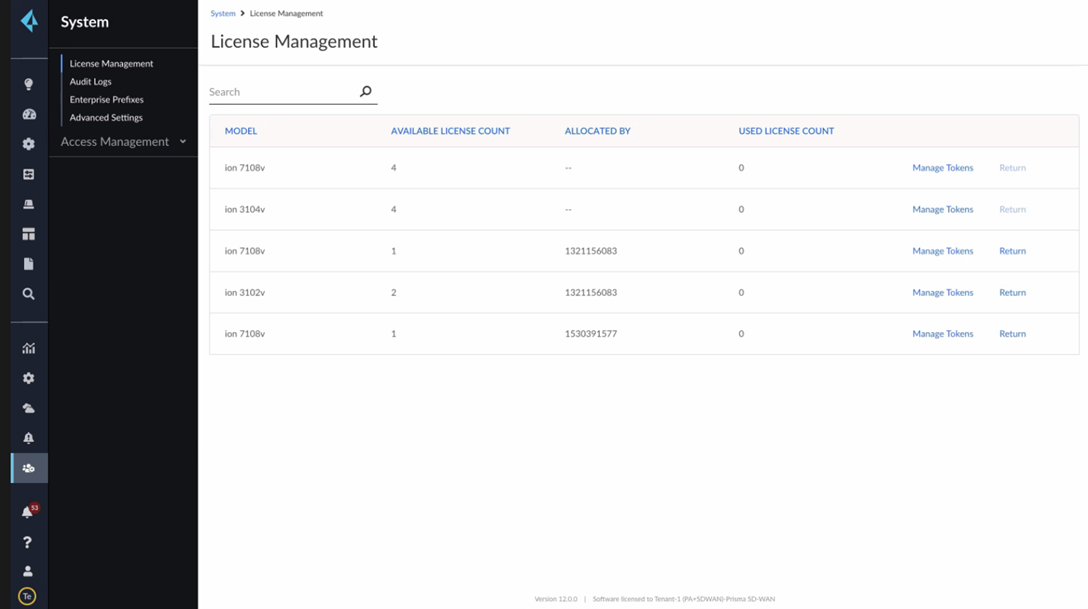 - From the Strata Multitenant Cloud Manager, access Prisma SD-WAN.Select SystemLicense Management