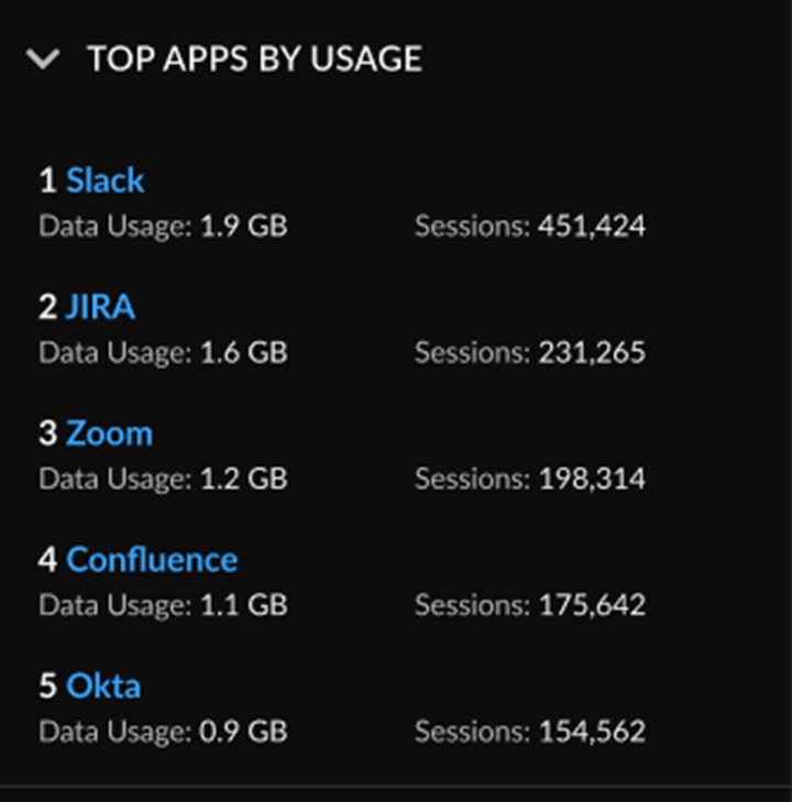 | Data Usage | Total traffic in the Prisma Access infrastructure that is directed to each app. |