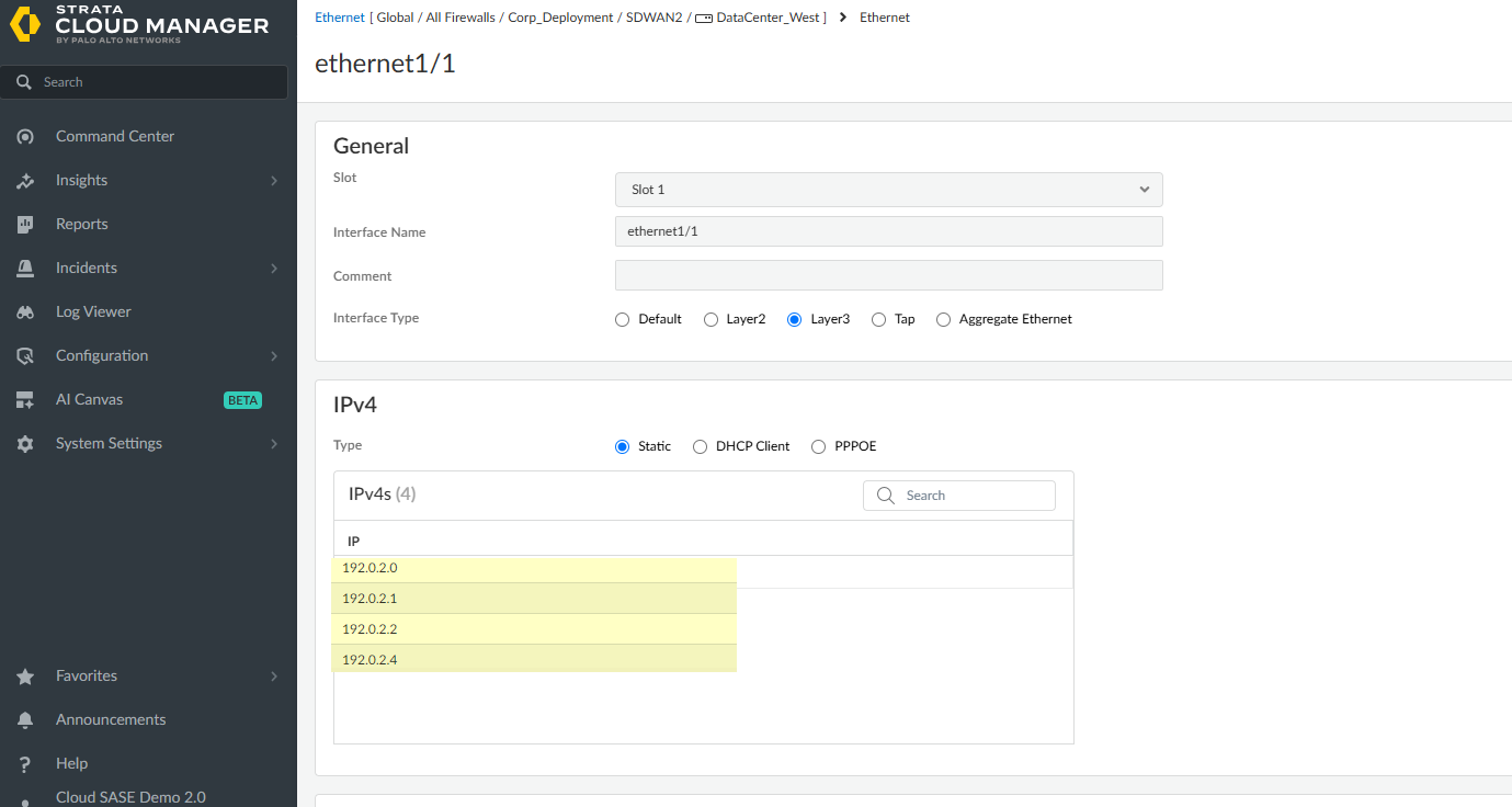 Contact your account team to enable Cloud Management for NGFWs using Strata Cloud Manager.Configure the physical Ethernet interfaces and SD-WAN interface profile to enable SD-WAN functionality and define the characteristics of the ISP connections the firewall monitors. Additionally, you must create the SD-WAN VPN cluster to determine which branches communicate with which hubs and to create a secure connection between the branch and hub firewalls.- Log in to Strata Cloud Manager.Set up SD-WAN.Configure a layer 3 interface.Layer 3 interfaces are required for SD-WAN functionality. Repeat this step to configure as many Layer 3 Ethernet interfaces on your SD-WAN firewall as needed.You can configure up to four IP addresses for an SD-WAN enabled interface. The Auto VPN workflows uses only the first IP address from the configured IPv4 address list to create the VPN tunnel and ignores the remaining IPv4 addresses in the list.
