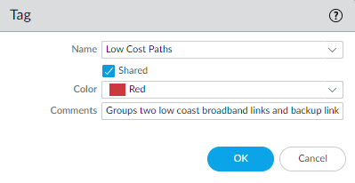 - Log in to the Panorama Web Interface.Select ObjectsTags and select the appropriate device group from the Device Group context drop-down.Add a new tag.Enter a descriptive Name for the tag. For example; Low Cost Paths, Expensive Paths, General Access, Private HQ, or Backup.Enable (check) Shared to make the Link Tag available to all device groups on the Panorama® management server and to the default vsys on a single vsys hub or branch, or to vsys1 on any multi-vsys hub or branch that you push to.By configuring a Shared Link Tag, Panorama is able to reference the Link Tags in the firewall configuration validation and successfully commits and pushes the configuration to branches and hubs. The commit fails if Panorama is unable to reference a Link Tag.(Optional) Select a Color for the tag.Enter helpful Comments about the tag. For example, Group two low cost broadband links and a backup link for general access to the internet.