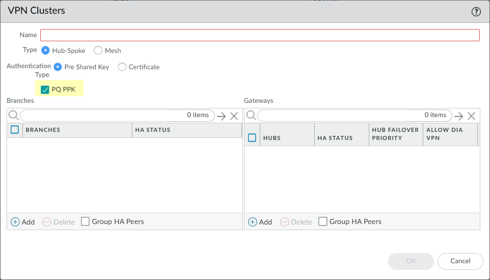 - When multiple VPN clusters with PQ PPK share a hub firewall, then the shared hub firewall cannot simultaneously support some clusters with PQ PPK enabled and others using standard PSK authentication. That is, all VPN clusters connected to a shared hub firewall must either use PSK or use PQ PPK.