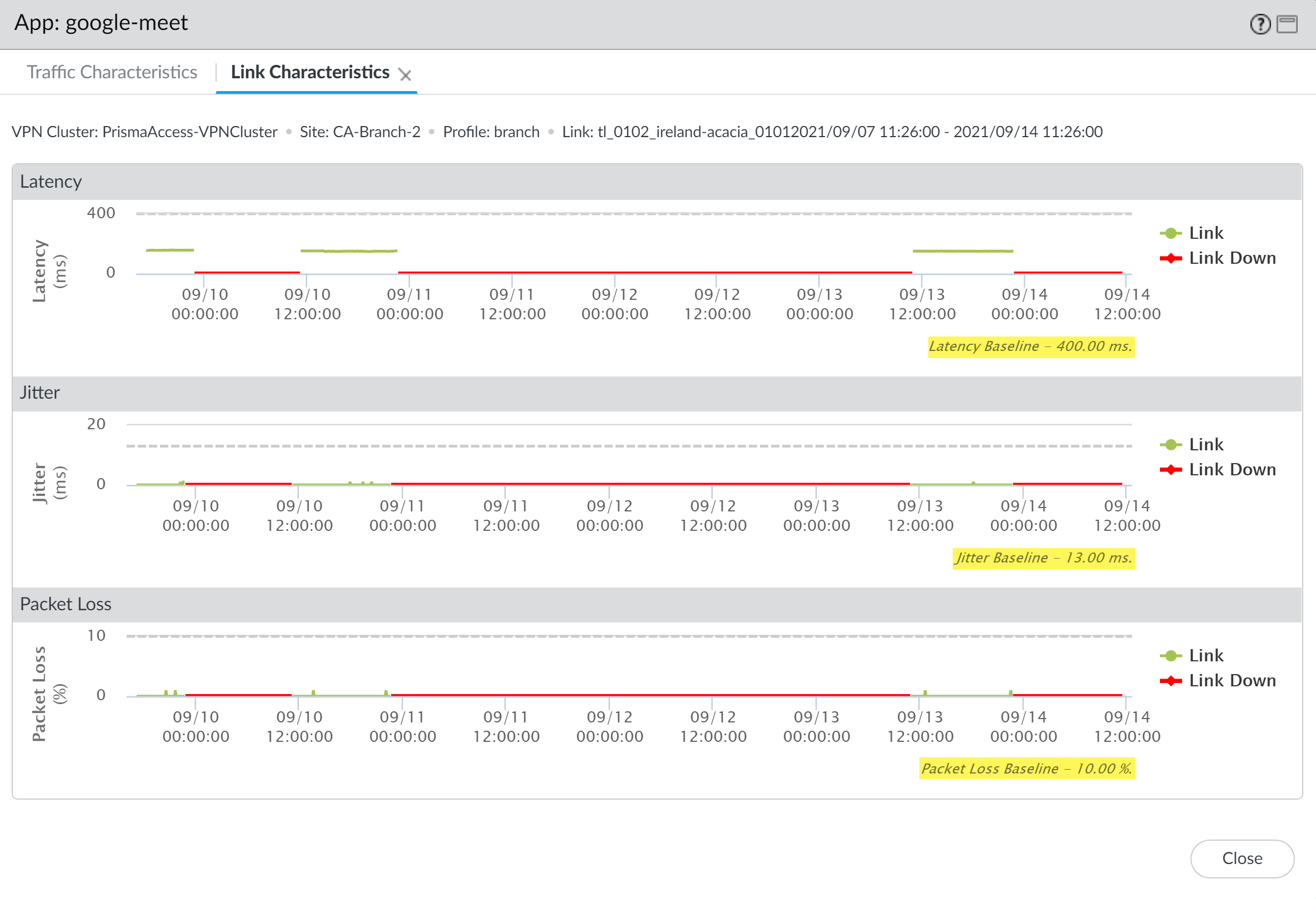 Review the link characteristics for a Prisma Access Hub application.- Click an application in the App Performance section to view the Traffic Characteristics and the links used for the applications traffic.Click each Link to view the baseline latency, jitter, and packet loss measured for the application across the link.Repeat this for all links until you gather sufficient baseline data to modify your Prisma Access Hub path quality profile.