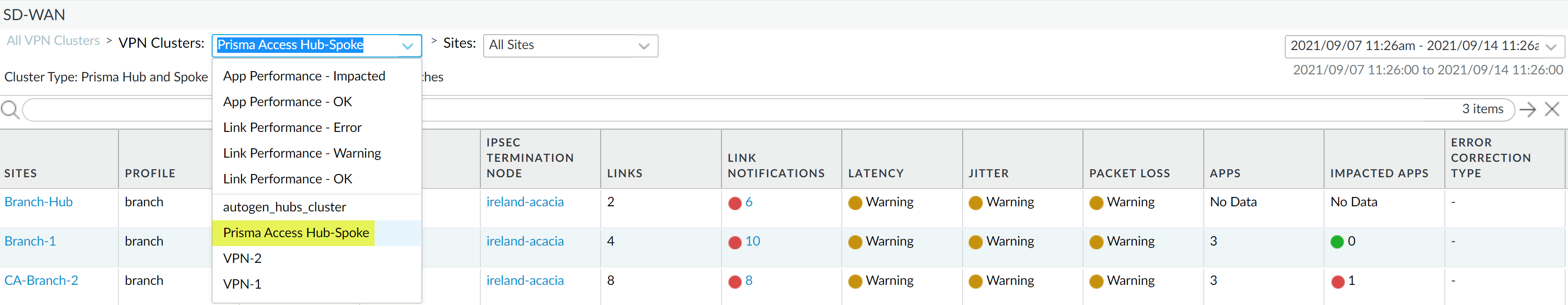 - Click an App Performance or Link Performance summary that indicates Impacted, Error, or Warning counts to view a detailed list of sites and their status based on latency, jitter, and packet loss.In the VPN Cluster filter, select Prisma Access Hub-Spoke.Click a Site to view in-depth health details for the Prisma Access Hub.