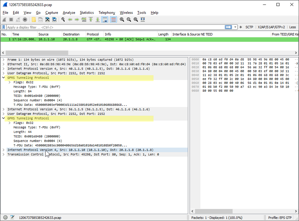 Get a packet capture of a GTP event, such as GTP-in-GTP,