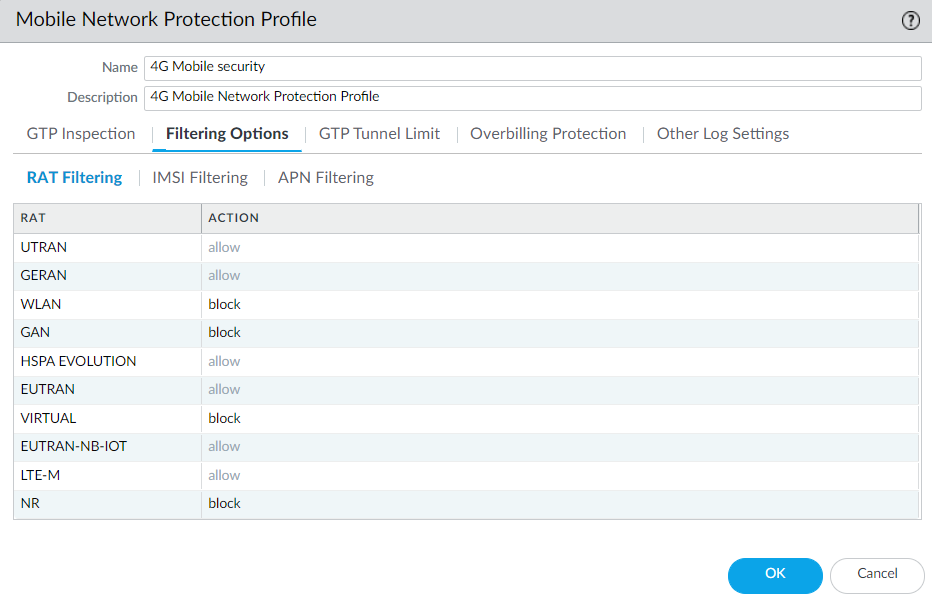 Select Filtering Options and RAT Filtering; for example, you can allow UTRAN, GERAN, HSPA EVOLUTION, EUTRAN, EUTRAN-NB-IOT, and LTE-M and block other RATs.
