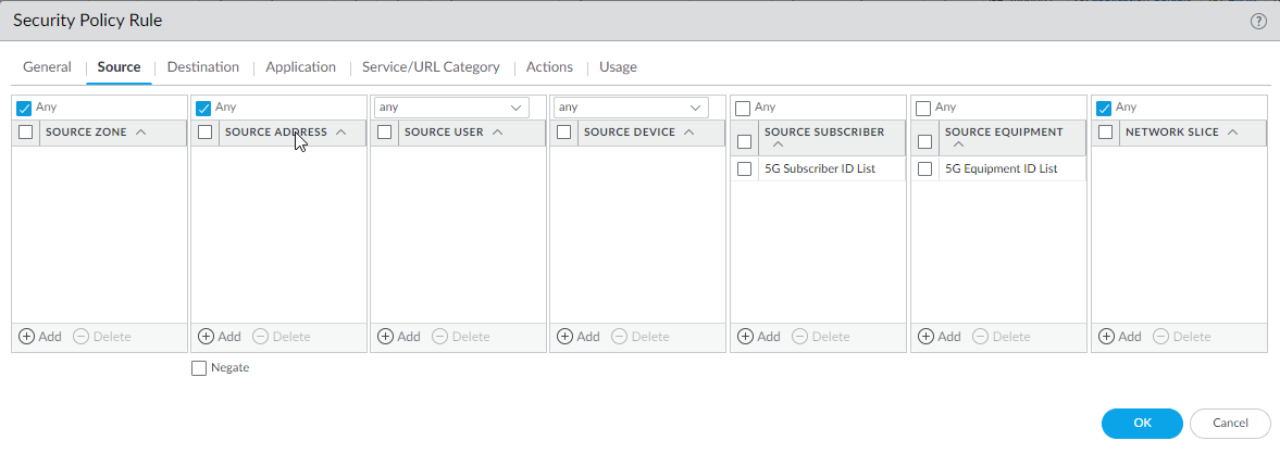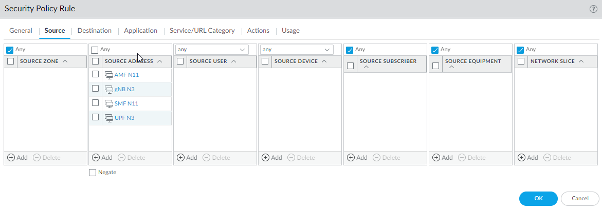 (Optional) Select Other Log Settings and Log User Location.(Optional) To troubleshoot, select Other Log Settings and select 5G Allowed Messages N11 (the HTTP/2 control messages). You can also enable GTP-U Allowed Messages for Tunnel Management, Path Management, and G-PDU.Click OK.Create address objects for the IP addresses assigned to the network elements in your topology, such as the AMF on the N11 interface, the gNB on the N3 interface, the SMF on the N11 interface, and the UPF on the N3 interface.(Optional) Create an External Dynamic List (EDL) of Type Subscriber Identity List; the Source of the list provides access to a server that provides identifiers of IoT devices connected to the 5G network, for which you want to allow (or deny) traffic.Create a Security policy rule that applies your Mobile Network Protection profile to application traffic.- Select PoliciesSecurity and Add a Security policy rule by Name.Select Source tab and Add a Source Zone or select Any.For Source Address, Add the address objects for the 5G element endpoints on the N3 and N11 interfaces that you want to allow.