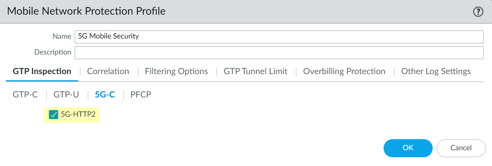 - Select ObjectsSecurity ProfilesMobile Network Protection.Add a profile by Name, for example, 5G Mobile security.Enter a Description.On the GTP Inspection tab, select 5G-C.Enable 5G-HTTP2 to enable inspection of 5G HTTP/2 control packets.