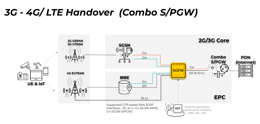 If you deploy the firewall for RAN security in a mobile network that uses both 3G and 4G/LTE technologies, the firewall supports a deployment option that enforces GTP security in network topologies that contain a combo node of a Serving Gateway (SGW) and Packet Gateway (PGW) known as S-PGW. In this network topology, the S5 interface is not exposed, so to support migration between 3G and 4G/LTE, PAN-OS uses the Gn (SGSN-MME) interface.