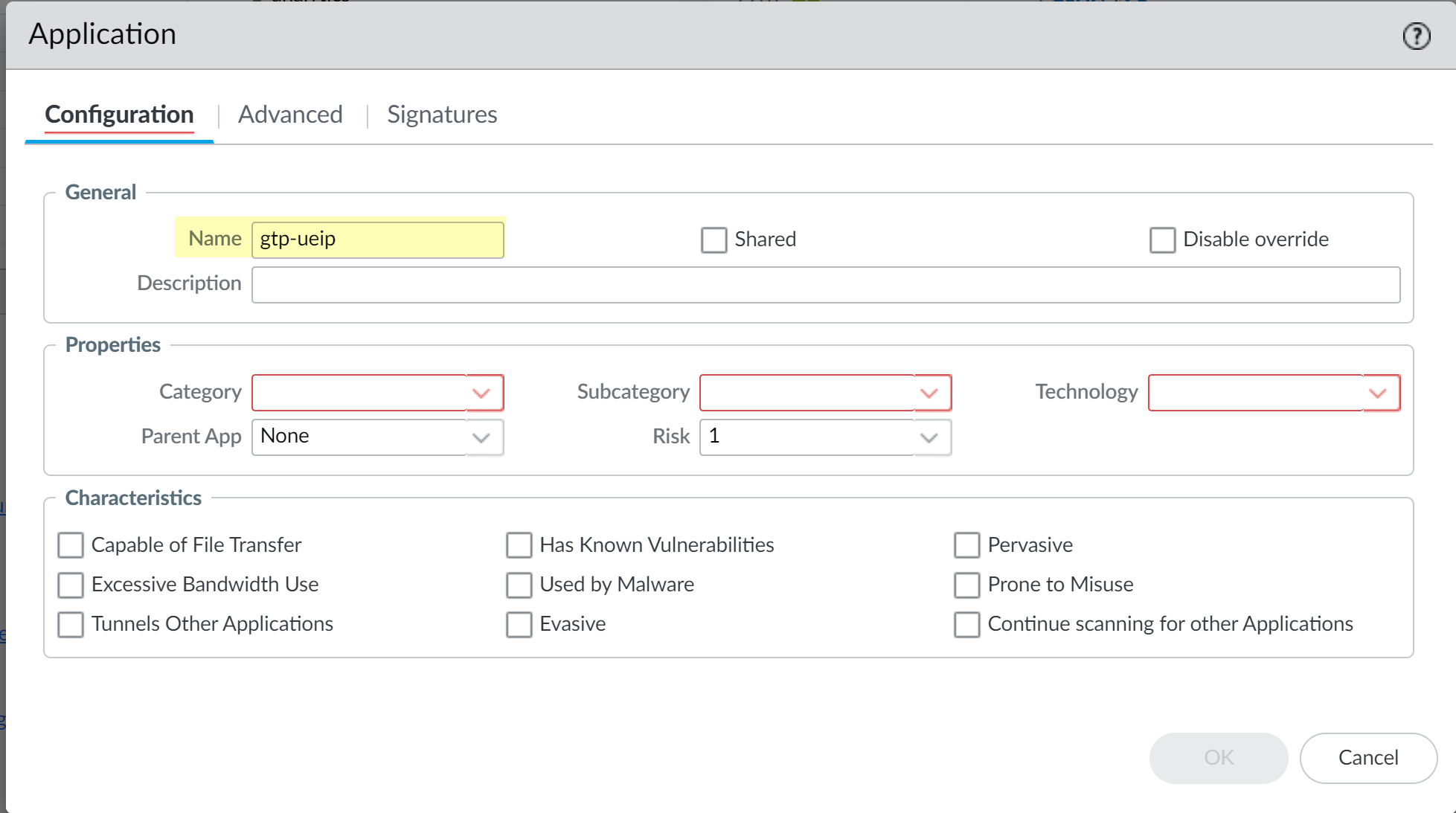 Create a custom application and a Security policy that uses the custom application. (Required if you allow traffic between only the MME and the SGW or SGSN and GGSN)Because the firewall must apply this policy rule first to process the first packet of all user traffic and enables UEIP database querying, move this policy rule above any other policy rules in your Security policy for user traffic on the N6 interface. Any application-specific IMSI or IMEI-based policy rules must occur after this policy rule.- Select ObjectsApplications and Add a unique Name for the application (for example, gtp-ueip), then click OK.