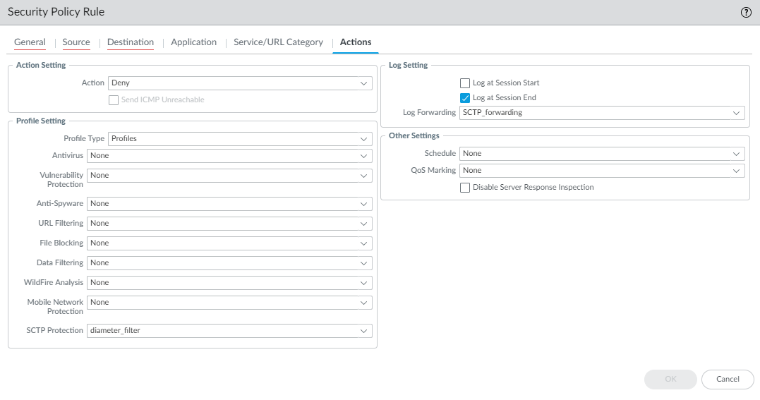 Click OK to save the SCTP Protection profile. If none of the SCTP, Diameter, or SS7 filters match the SCTP packet, the firewall allows the packet by default.Apply the SCTP Protection profile to a Security policy rule.Palo Alto Networks strongly recommends that you add the IP addresses of the valid SCTP endpoints as the Source Address and Destination Address in your Security policy. This helps protect against meddler in the middle (MitM) attacks where an attacker could send a malicious IP address.- Select PoliciesSecurity and select a Security policy rule, or Add a new Security policy rule.For the Source Zone, select a zone that includes the interface where you want to secure SCTP associations.On the Application tab, select sctp as the App-ID.Other SCTP-based App-IDs (such as s1ap, diameter-over-sctp, and m3ua) become nonfunctional when you enable SCTP security.On the Actions tab, select an Action and in the Profile Setting section, select the SCTP Protection profile you created.