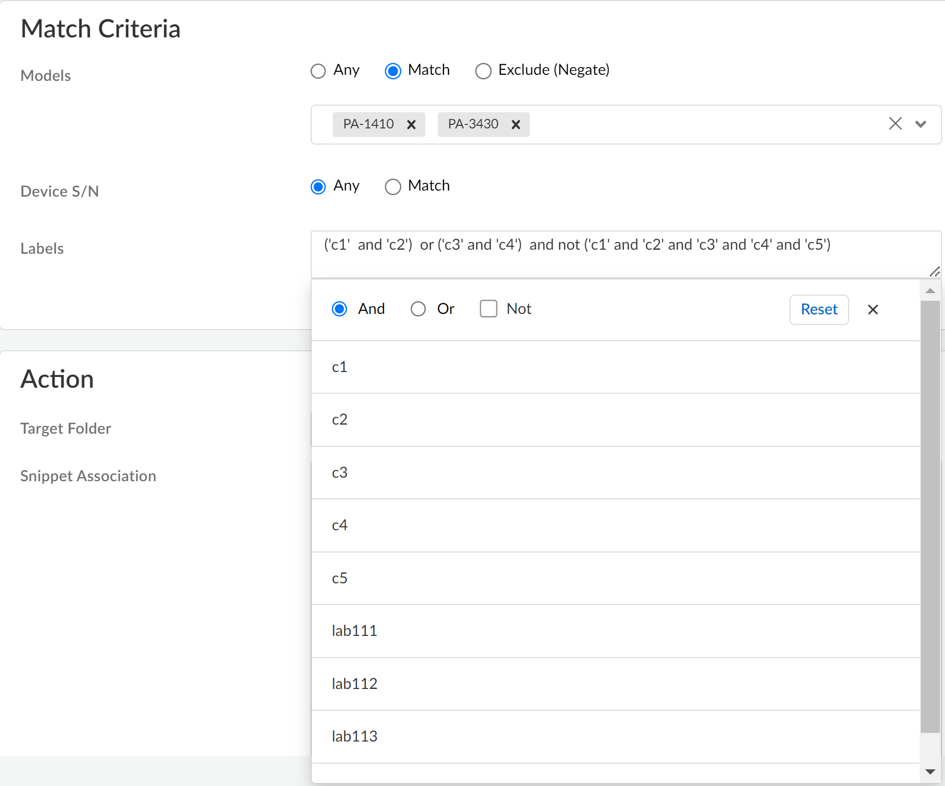 Specify Labels applied to Palo Alto Networks NGFW during onboarding that the onboarding rule applies to.You can use And, Or, and Not operators to write a logical expression of labels to match. You can use parentheses (()) to group sets of labels and logical operators when writing your regular expression.