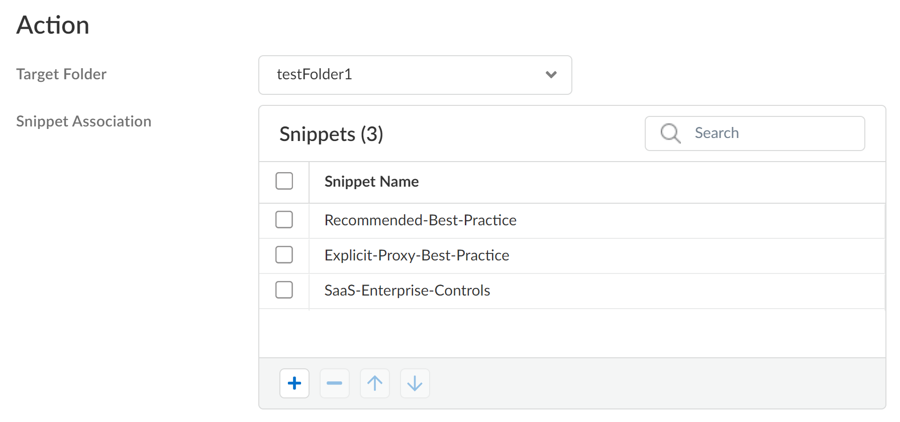 Define the onboarding rule Action.- Select the Target Folder the firewall is added to if it matches the device onboarding rule.If no Target Folder is specified, then the firewall is added to the default All Firewalls folder.(VM-Series, funded with Software NGFW Credits) You can configure the dgname field in the init.cfg.txt bootstrap parameters to add the VM-Series firewall to a target folder. In this case, Strata Cloud Manager prioritizes adding the VM-Series firewall to the target folder configured in the init.cfg.txt file over the one configured in the device onboarding rule.For Snippet Association, apply snippet configuration to the onboarded firewall after it successfully connects to Strata Cloud Manager.Snippets are a tool used to standardize a common base configuration for a set of firewalls or deployments. This allows you to quickly onboard a new firewall with a known good configuration and reduces the time required to onboard a new firewall.