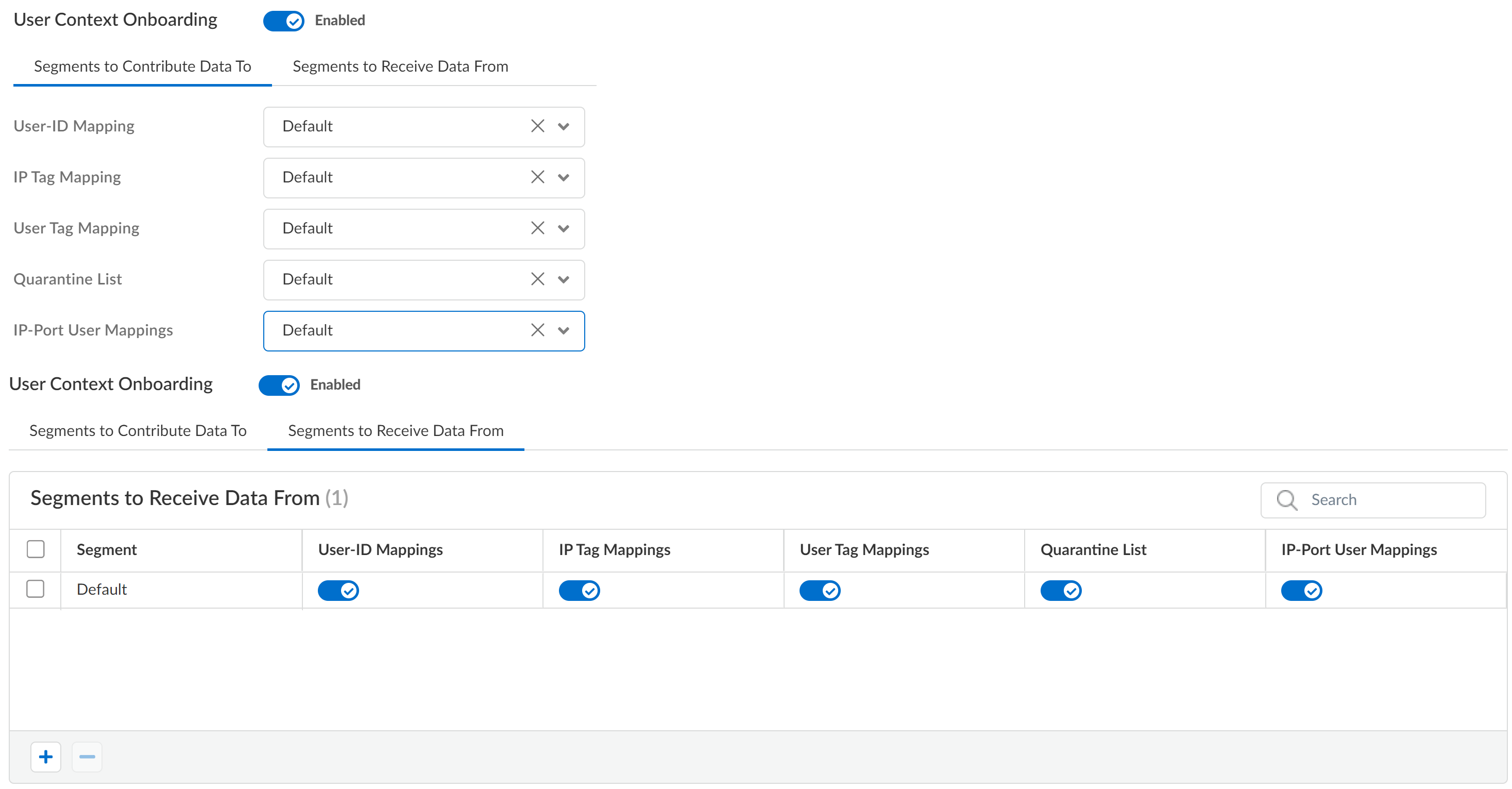 Enable User Context Onboarding to configure the user and tag mappings required for User Context for Cloud Identity Engine (CIE).User Context provides simplified granular control over the data that is shared across your security devices. It provides your administrators the flexibility to specify the data types each device sends and receives.If enabled, you must configure the Segments to Contribute Data To to customize the segment mappings the firewall sends to CIE and the Segments to Receive Data From to customize how CIE provides segment mappings to the firewall.