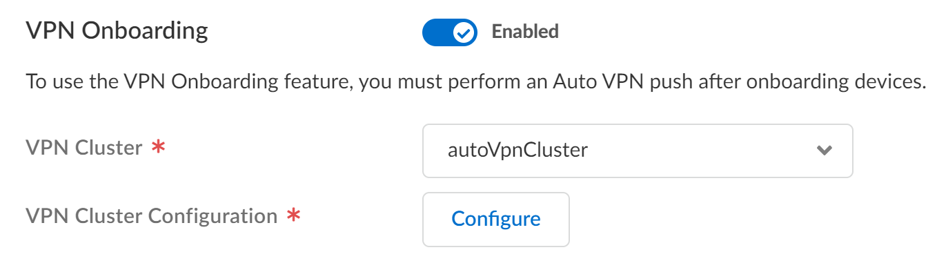 Enable VPN Onboarding if you have configured Auto VPN for secure hub-and-spoke connectivity between Strata Cloud Manager and your managed firewalls.If enabled, select the VPN Cluster to add the firewall to. This determines the gateway devices and automatically creates secure connections between the configured gateway and the newly onboarded firewall.Click Configure to configure the Palo Alto Networks NGFW as a hub or branch firewall.