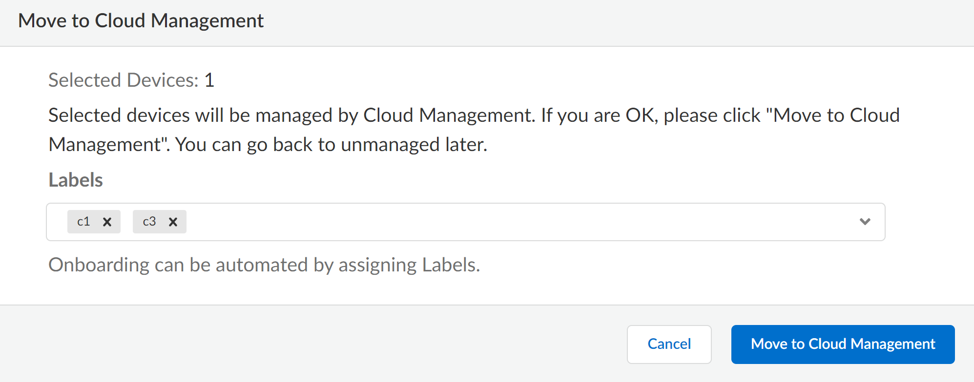(Optional) Apply Labels to the onboarded firewall.You can select an existing label or create a new label by typing the label you want to create.Click Move to Cloud to continue adding the firewall to Strata Cloud Manager.