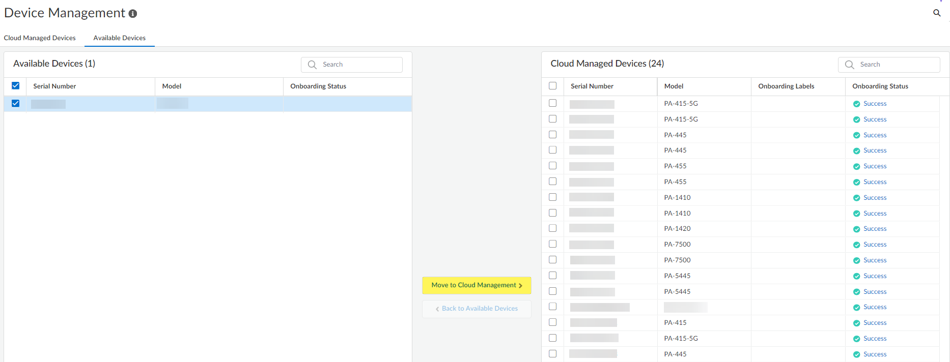 In the Device Associations page, verify the Associated Products for the onboarded firewall display AIOps for NGFW and Strata Logging Service.Add the available device to Strata Cloud Manager.- Select System SettingsDevice ManagementAvailable Devices.In the Available Devices select the firewall you just added.Move to Cloud Management.You are prompted to confirm the number of selected firewalls. Click Move to Cloud Management to continue.