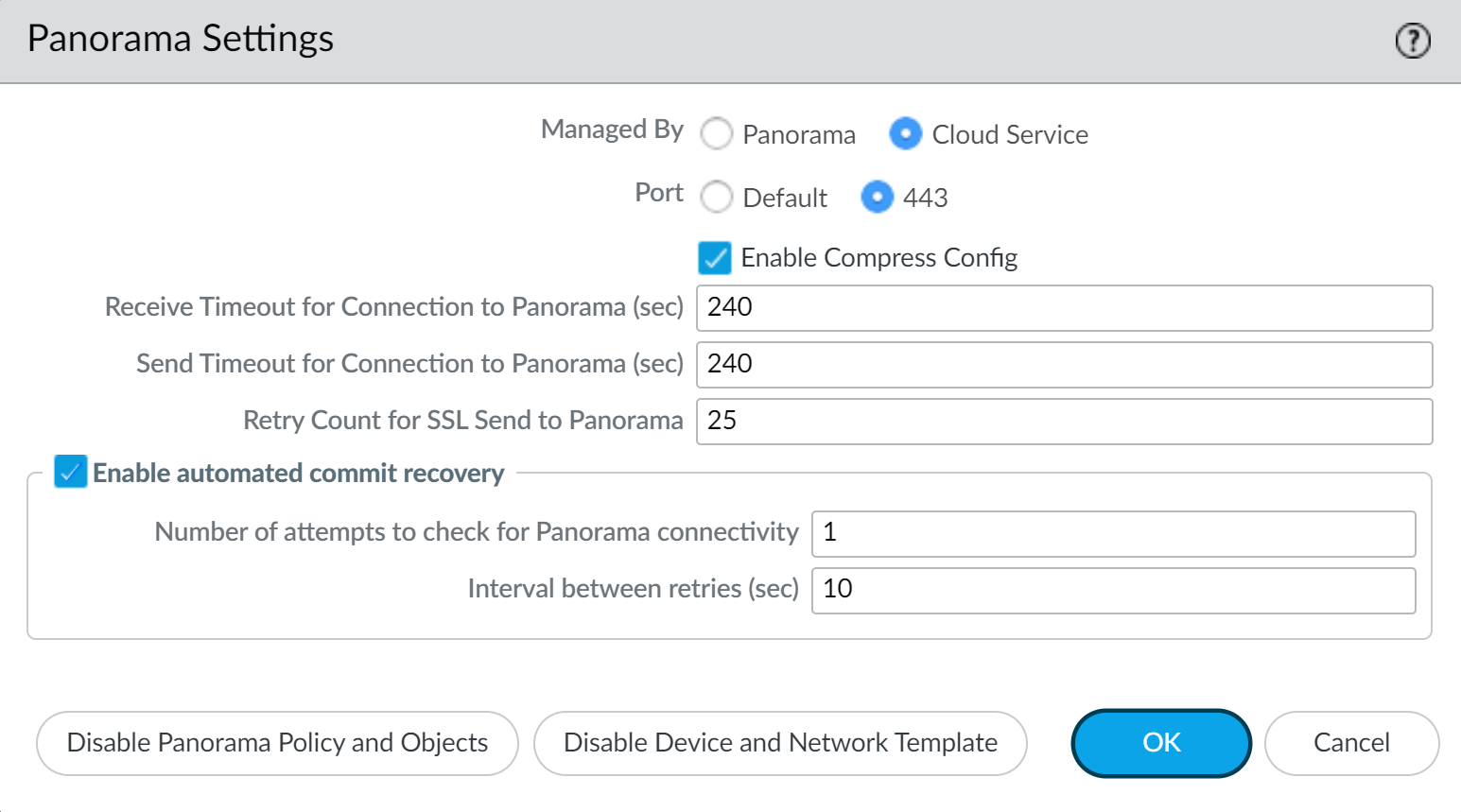 Configure the Panorama Settings.- Select DeviceSetupManagement and edit the Panorama Settings.