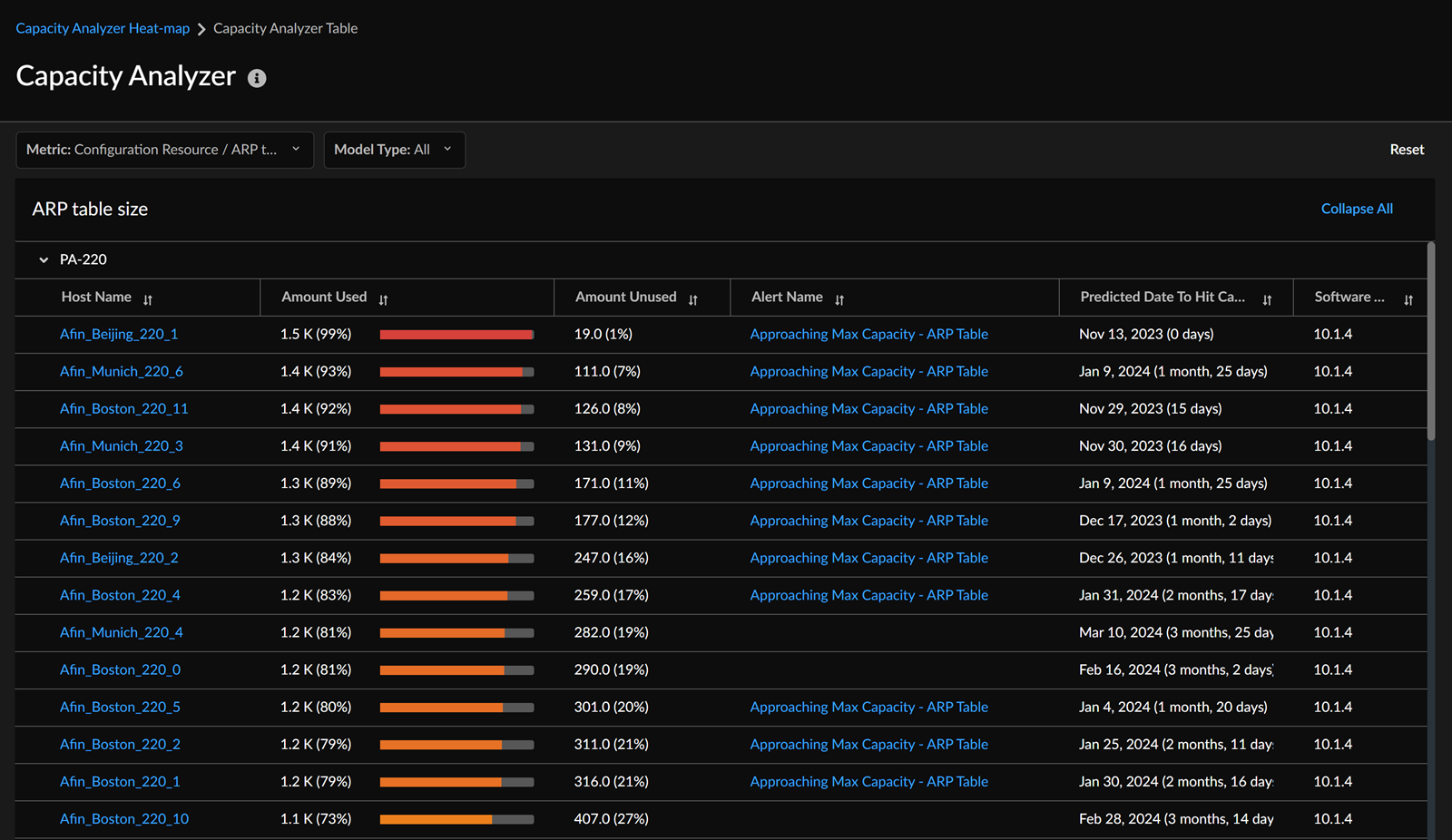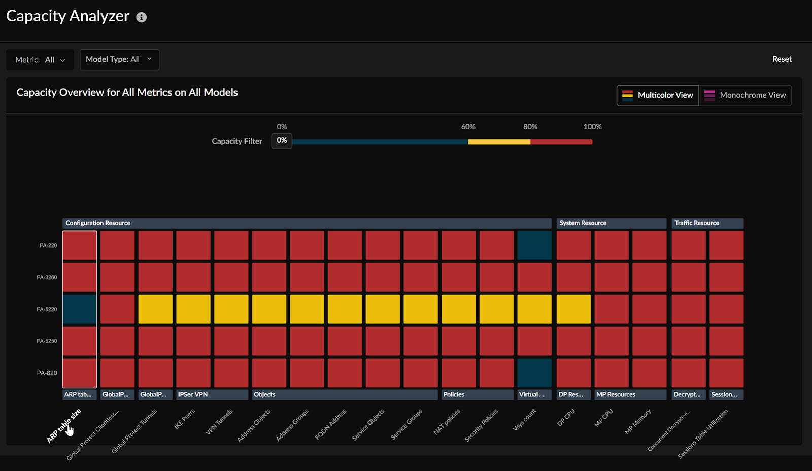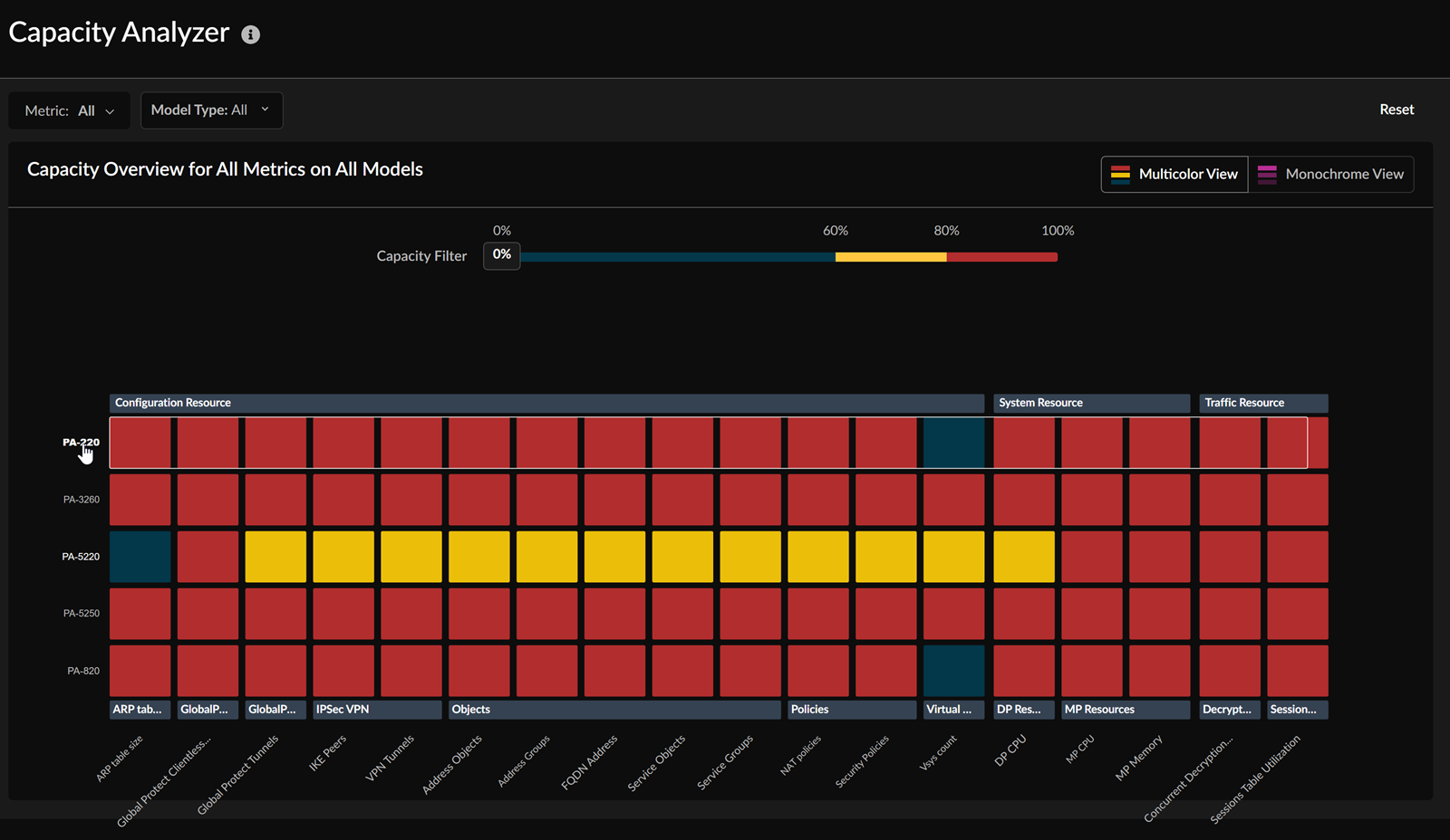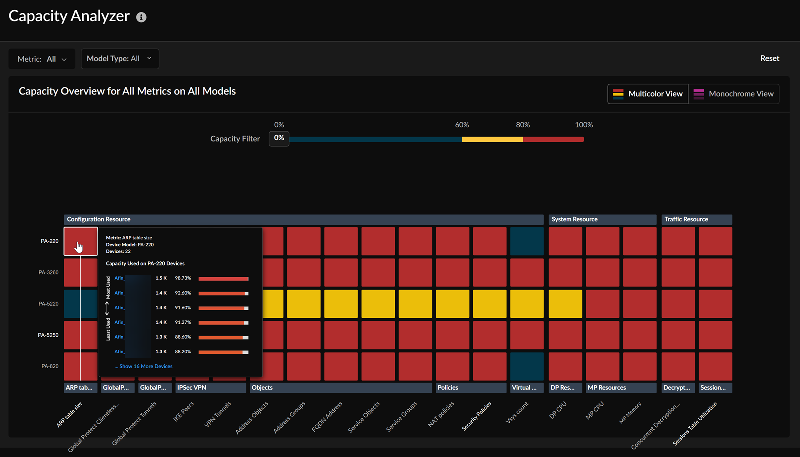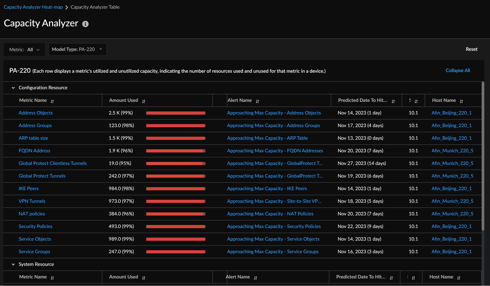From Strata Cloud Manager, navigate to InsightsNGFWCapacity Analyzer to analyze and monitor your devices' resource capacity by keeping track