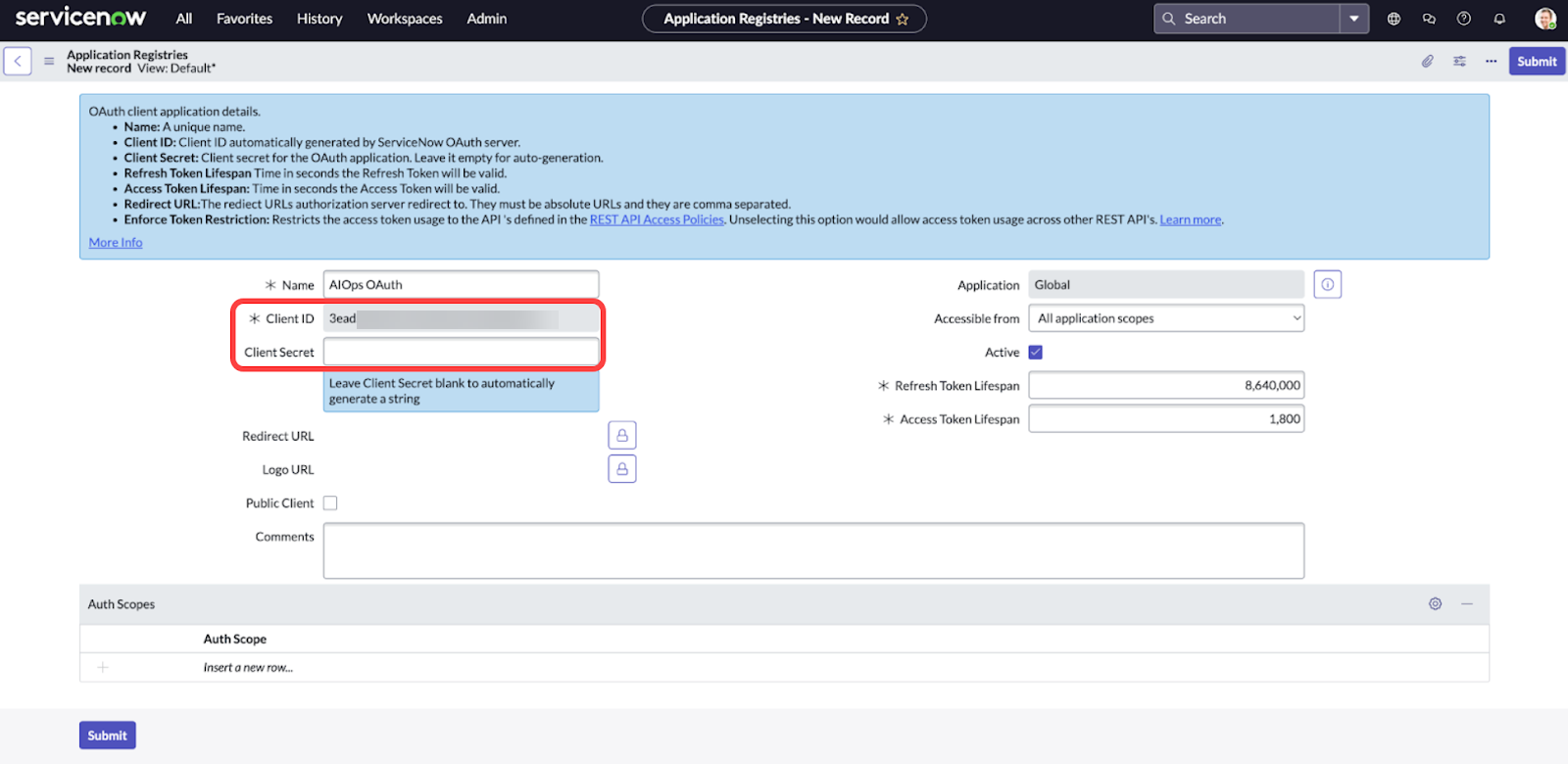Client credential forms in Strata Cloud Manager. See Add a ServiceNow Notification