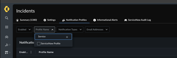 - To configure a ServiceNow notification profile using Strata Cloud Manager, go to Incidents > Incidents > Notification Profiles.Search for the predefined ServiceNow notification profile and select it.