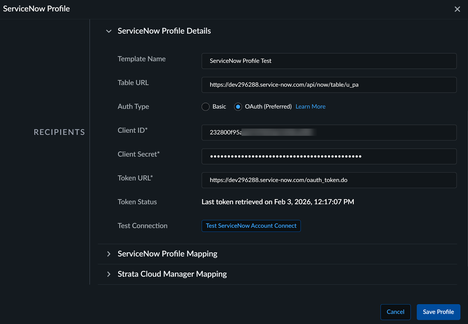 Enter Client ID and Client Secret created under Application Registry in order to authorize Strata Cloud Manager to access your ServiceNow Instance.Add Token URL (https://<instance-name>.service-now.com/oauth_token.do) for OAuth to exchange authorization grants for access tokens. The default token URL used is oauth_token.do. See Configure OAuth for ServiceNow Integration with Strata Cloud Manager. - Test ServiceNow Account Connect.Whenever you change the login credentials, you need to test the ServiceNow account connection. Only after a successful account connection, you can save the profile.