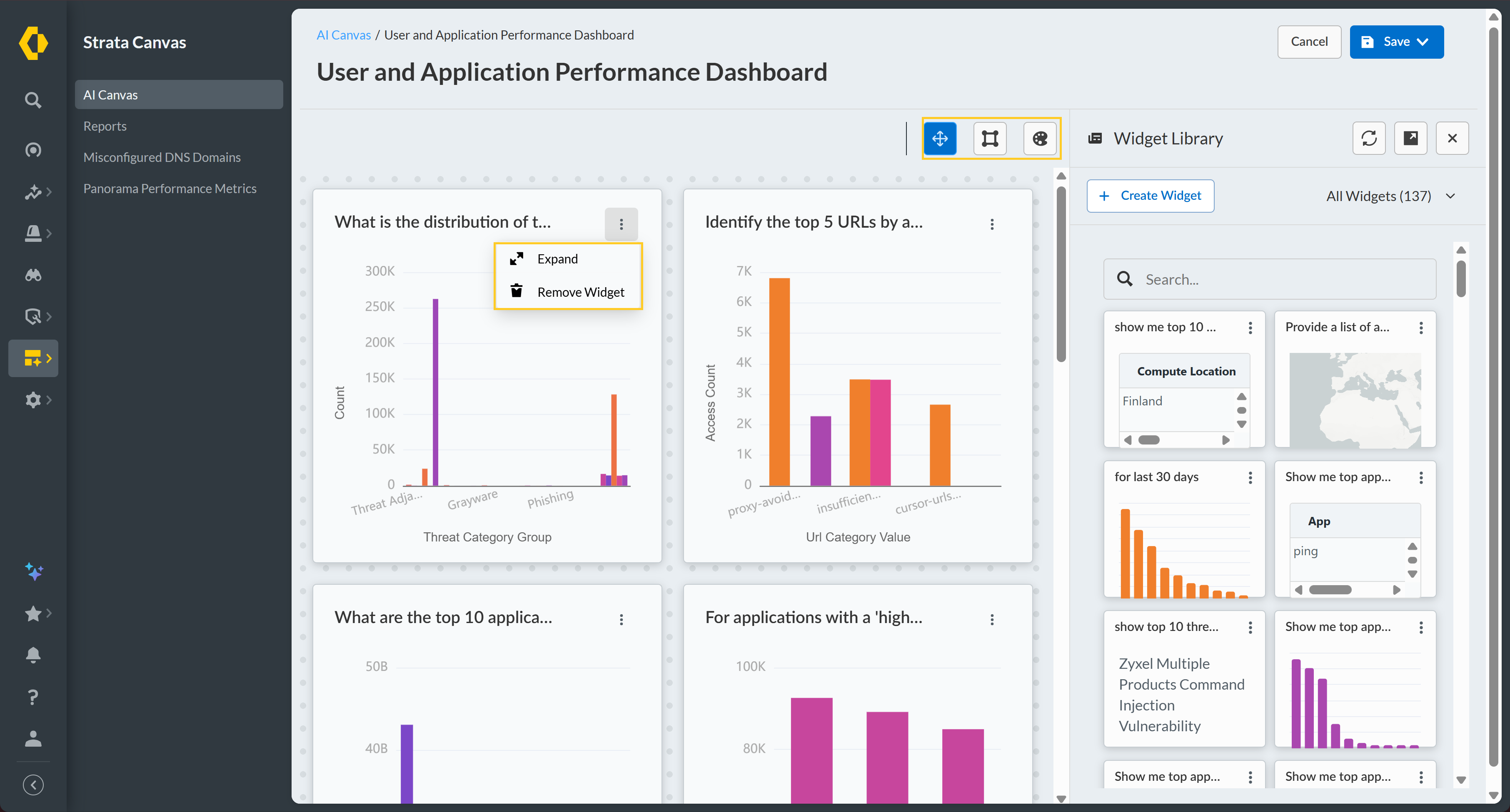 Learn how to create customizable AI Canvas dashboards in Strata Cloud Manager by building from scratch or generating from natural language queries to visualize your network data.