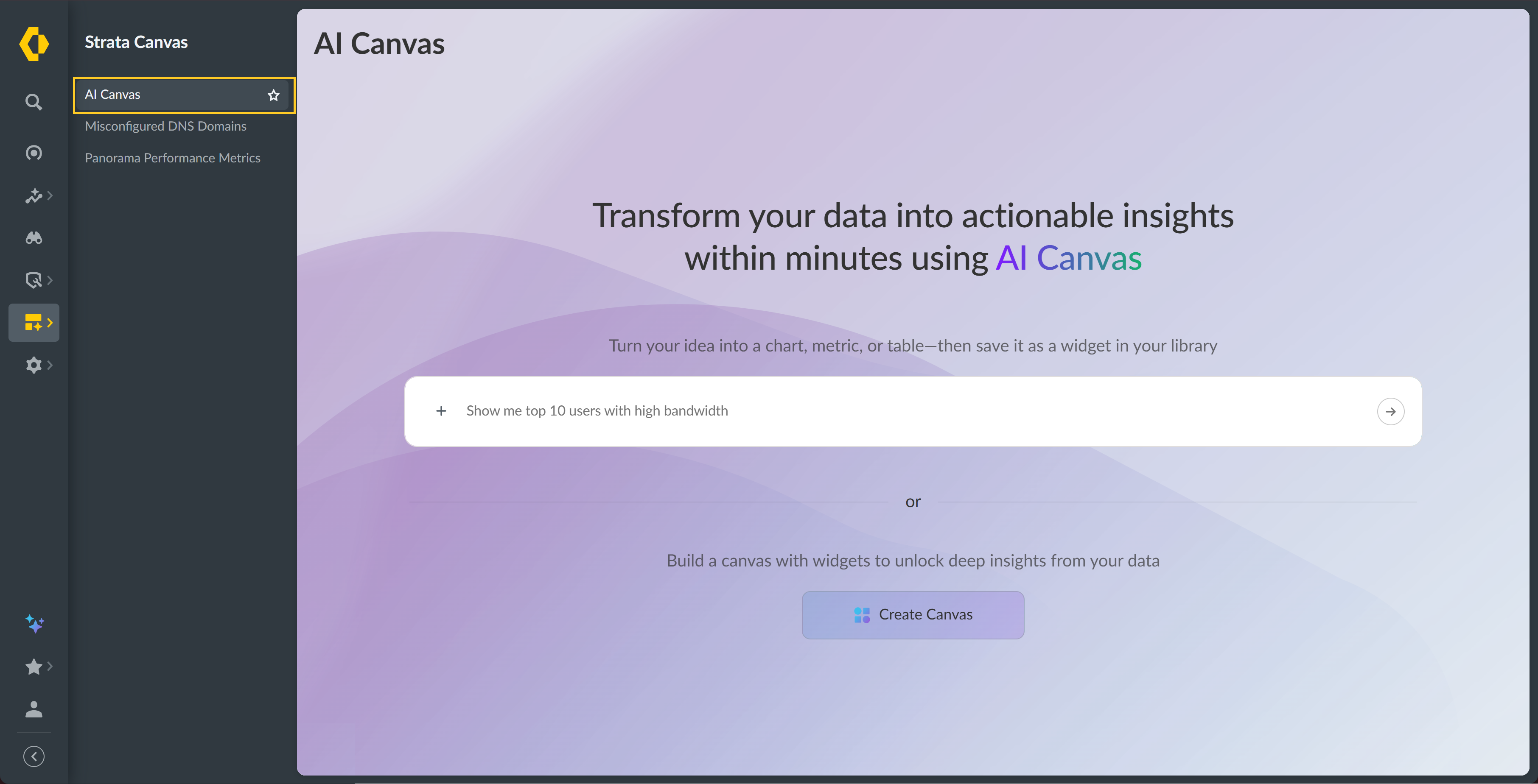 - Select Strata CanvasAI Canvas from Strata Cloud Manager menu.![]() Choose how you want to create your canvas: Choose how you want to create your canvas:- Generate a canvas from a query: Enter a descriptive query in the text field and click the arrow or press Enter key.Example queries:- Show me threats in my network that have occurred in the last 6 hours.