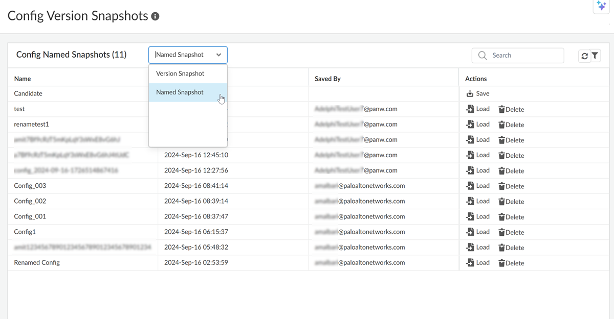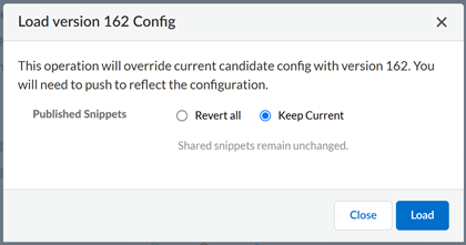 Load an earlier configuration snapshot to use as your candidate configuration.Once the configuration has been loaded, you can continue to make modifications to it before pushing.- Log into Strata Cloud Manager.Select ConfigurationOperationsConfig Version Snapshots.Select the config version you want to load.