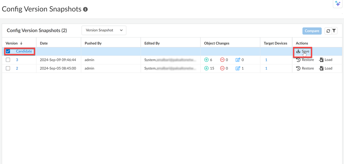 - Version—The version number of the configuration that was pushed.The Candidate allows you to compare the currently pending configuration changes to Strata Cloud Manager with a previous configuration version.The configuration version number is incremental. For example, if you have 10 versions and restore configuration version 2, the configuration version will change from 10 to 11 (it won’t show as 2).