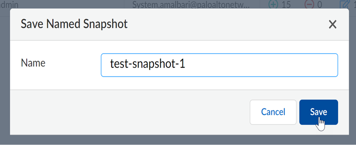 Save your snapshot.When you save a Named Snapshot, it will replace the current candidate configuration.(Optional) Verify that your snapshot was saved by navigating to the Named Snapshots in the Config Version Snapshot table.Managing Named SnapshotsAdministrators can delete their own Named Snapshots. Superusers can delete all Named Snapshots.